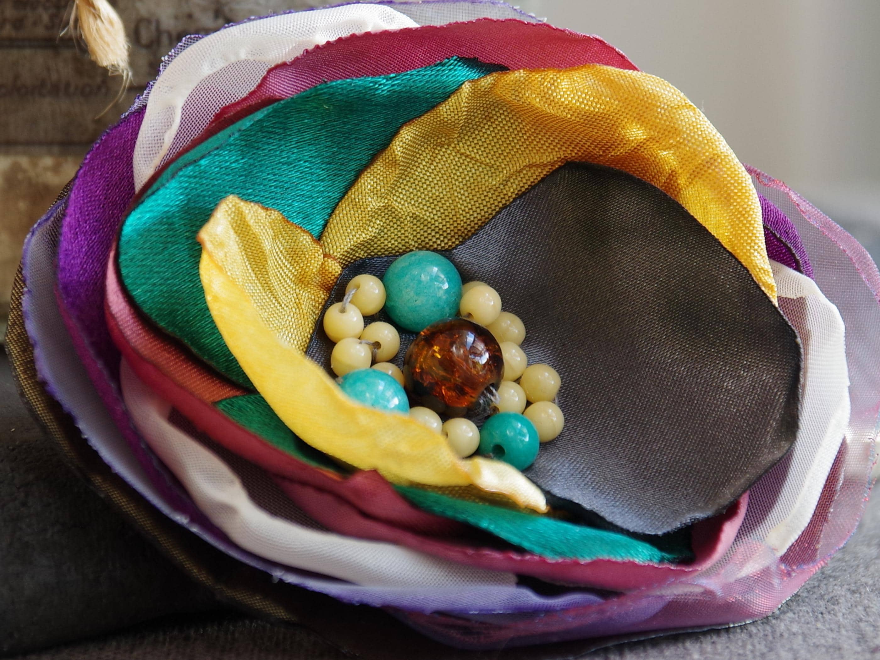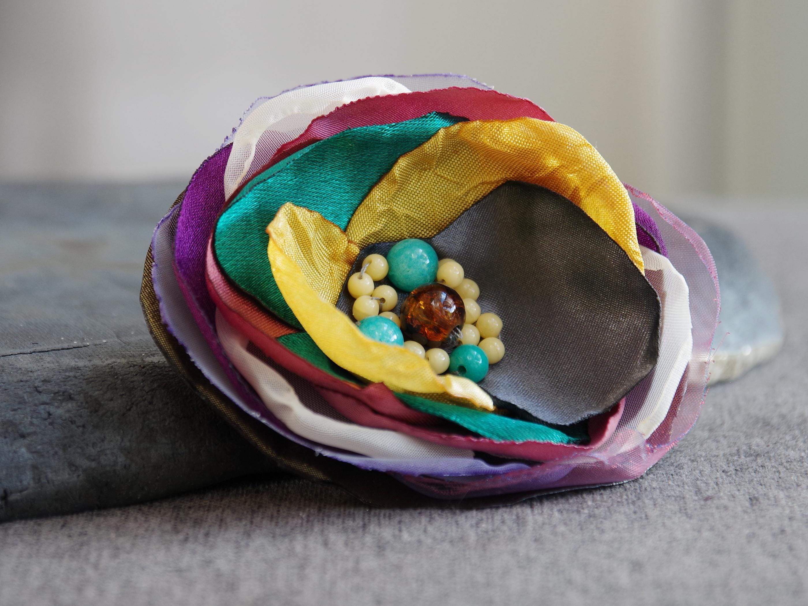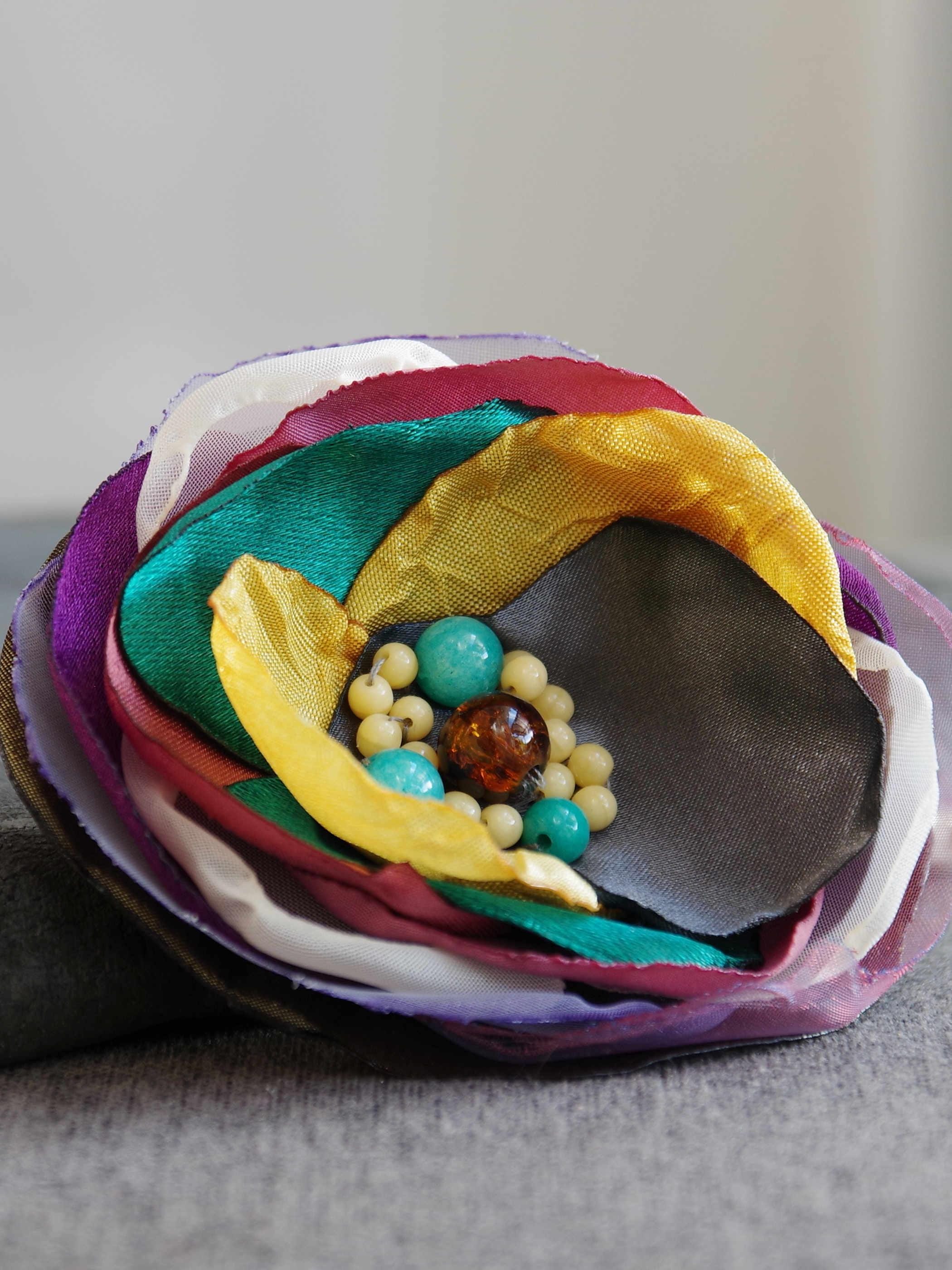 Handmade flower brooch pin - made from layers of delicate satin and organza fabric. This brooch looks very elegant and rich, it is embellished with many little beads.