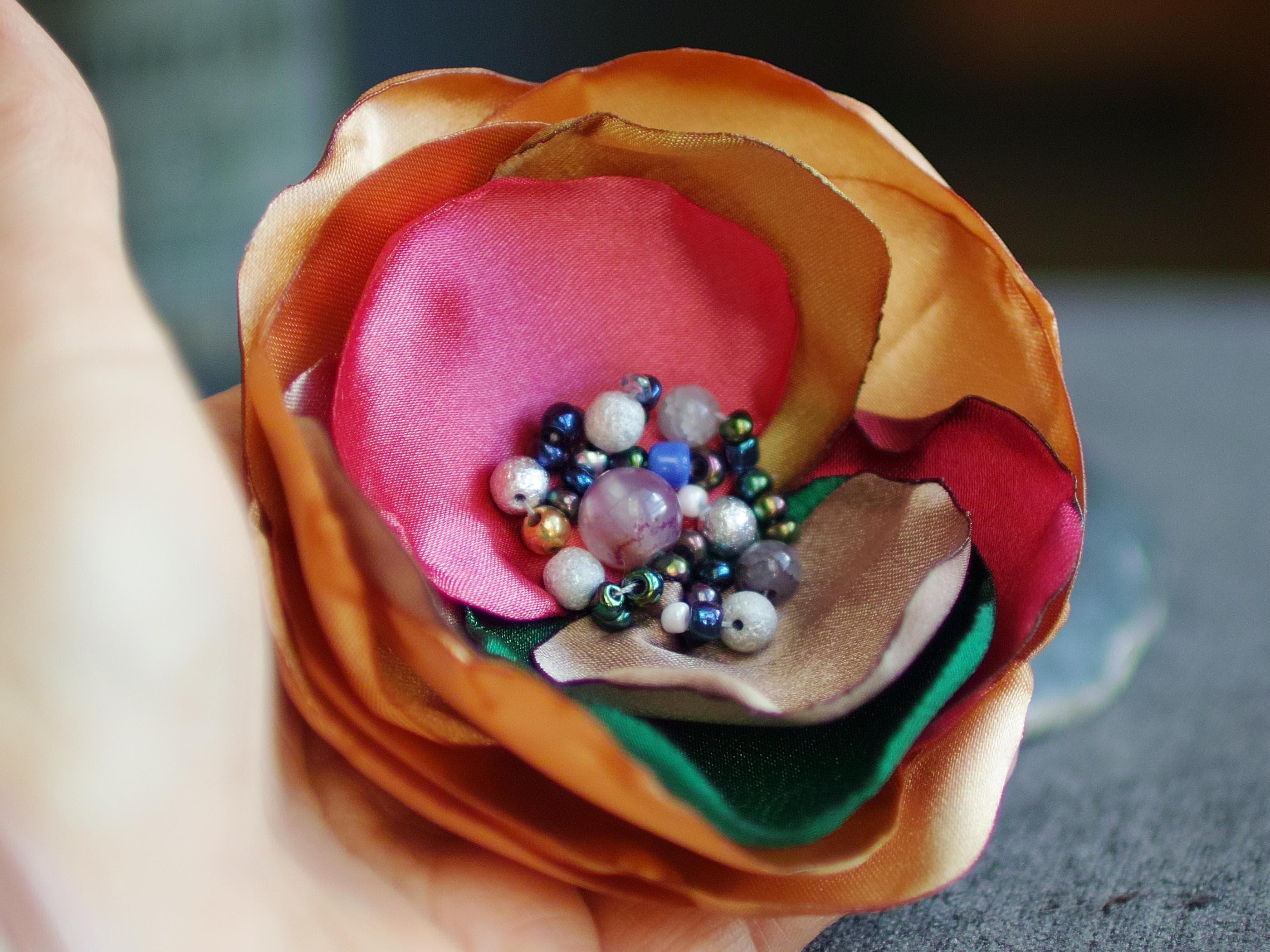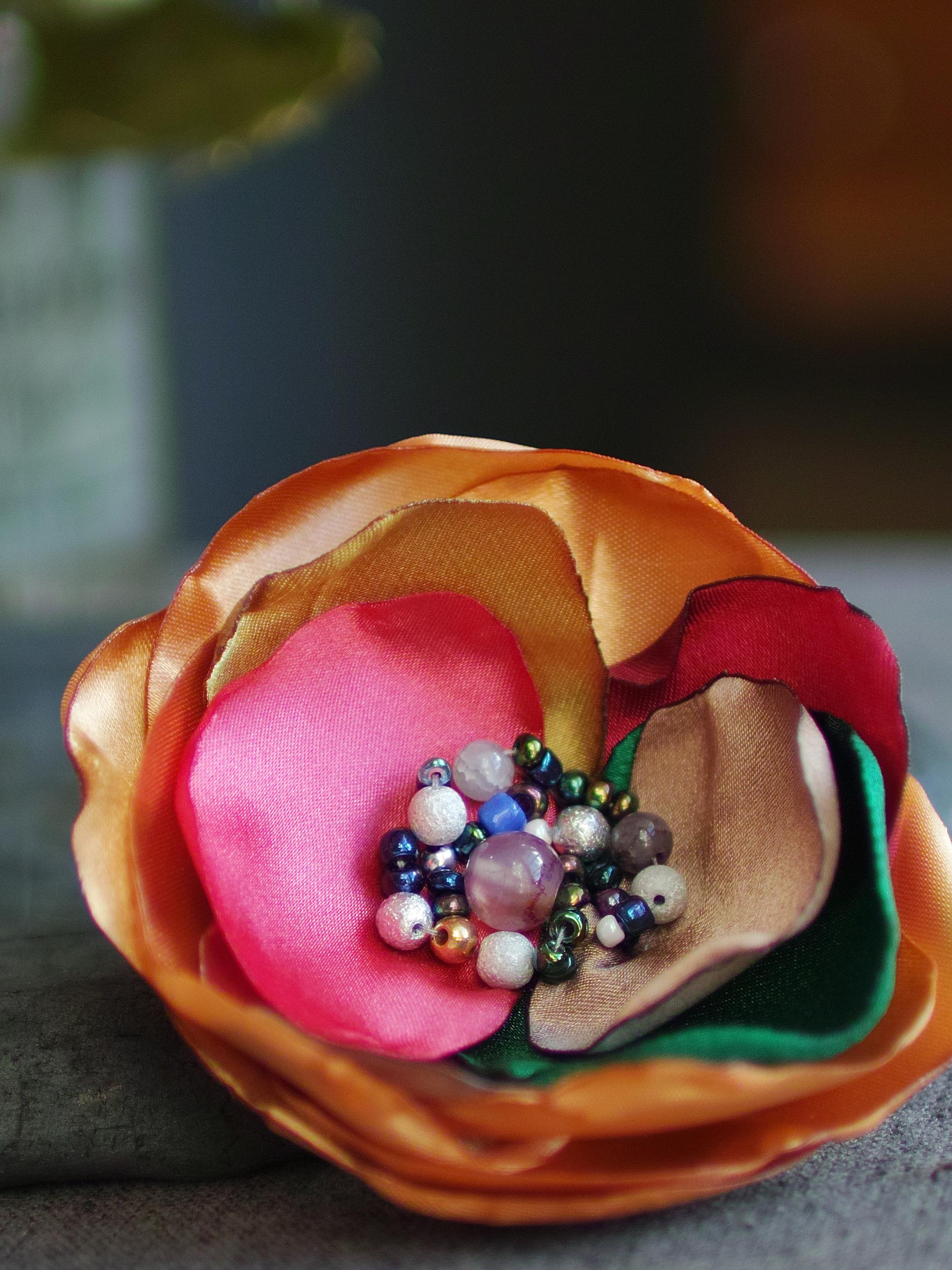 Handmade flower brooch pin - made from layers of delicate satin and organza fabric. This brooch looks very elegant and rich, it is embellished with many little beads.