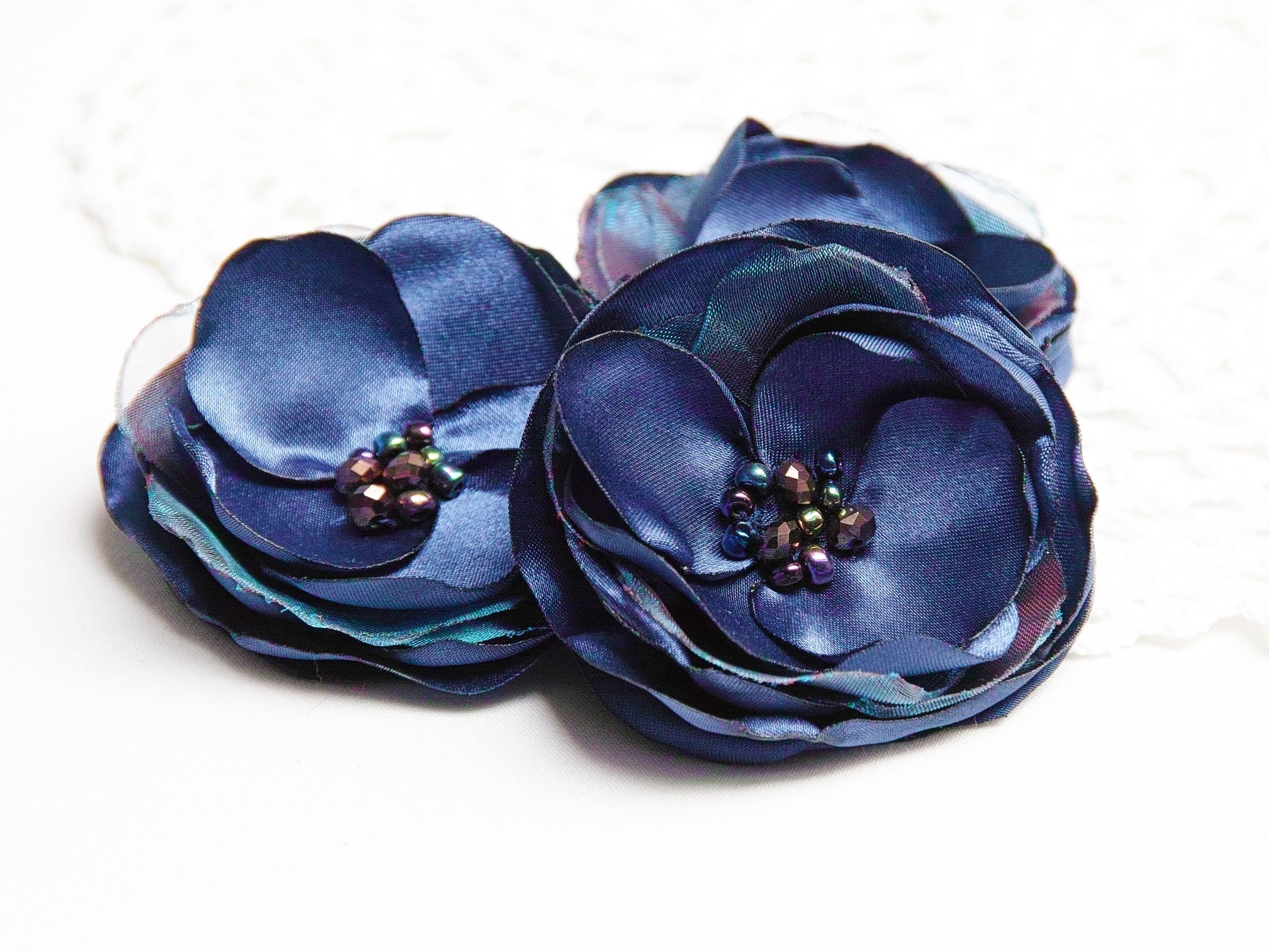 Handmade flower brooches from layers of delicate satin fabric. Brooches are embellished with some little beads.
