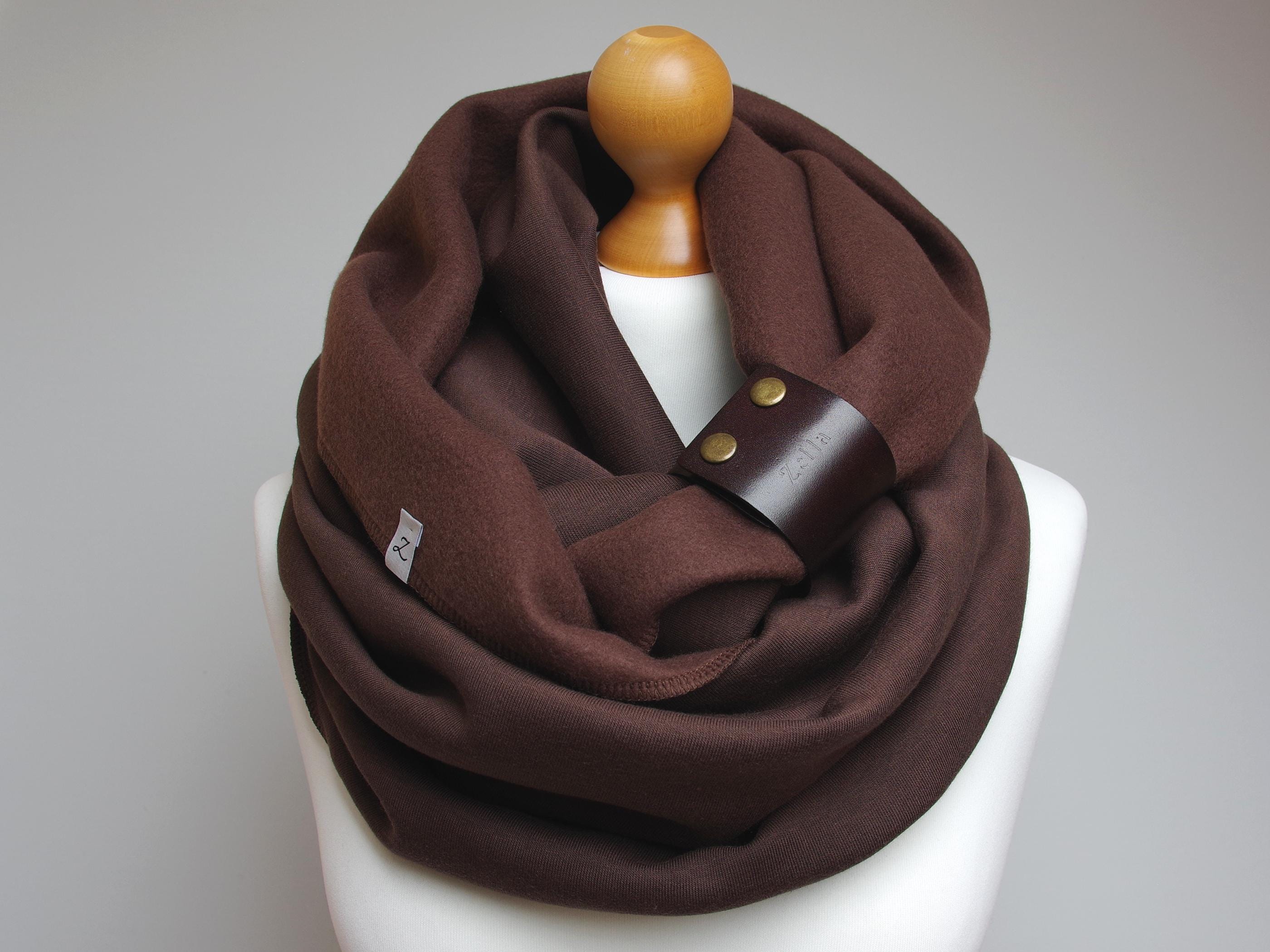 Stay warm and stylish with this brown chunky infinity scarf featuring a distinctive leather strap detail. This oversized infinity scarf is wide enough to be worn over the head, making it perfect for cold, windy or snowy days. A practical yet fashionable winter loop scarf for women.