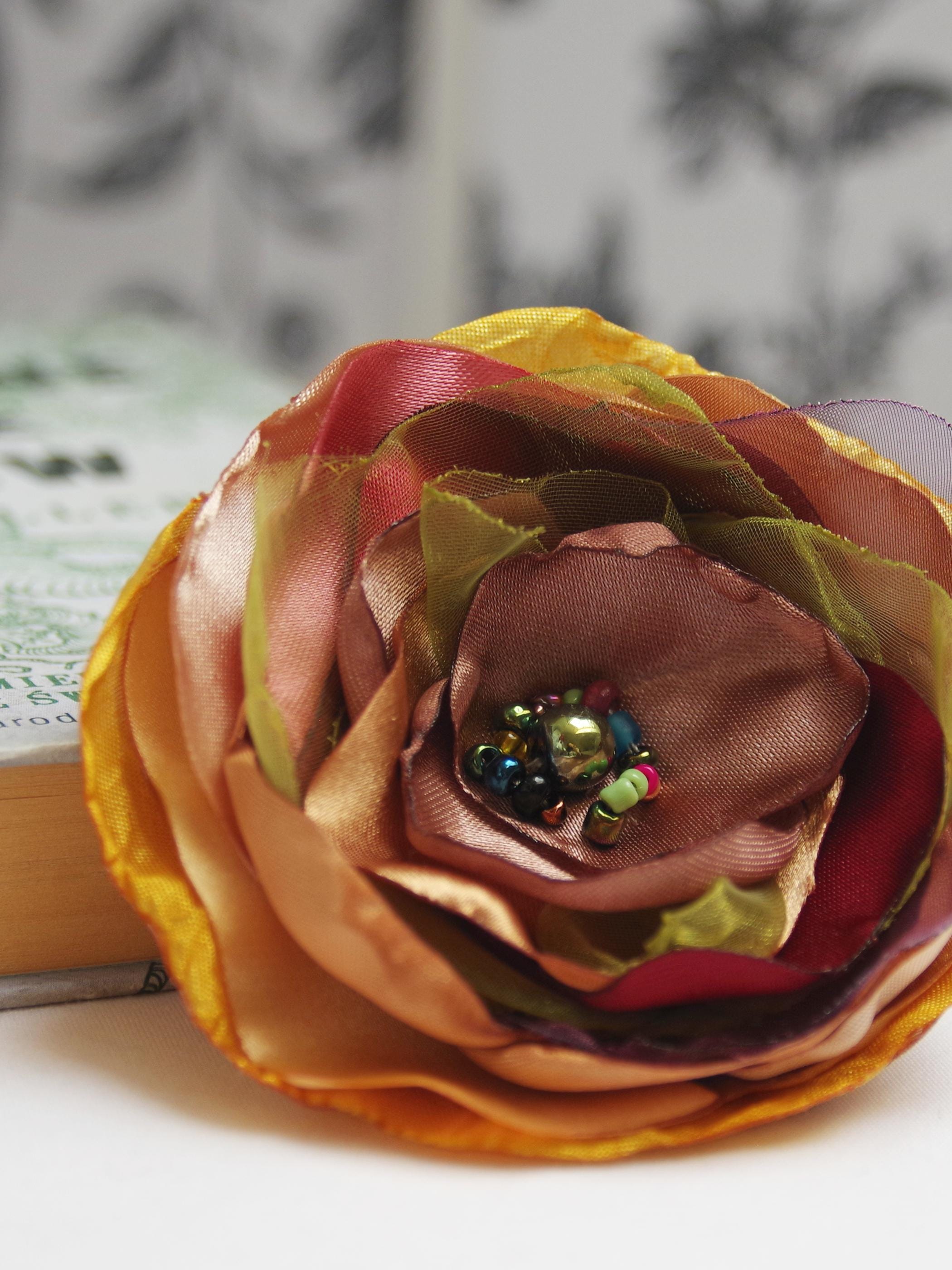 Handmade flower brooch pin - made from layers of delicate satin and organza fabric. This brooch looks very elegant and rich, it is embellished with many little beads.