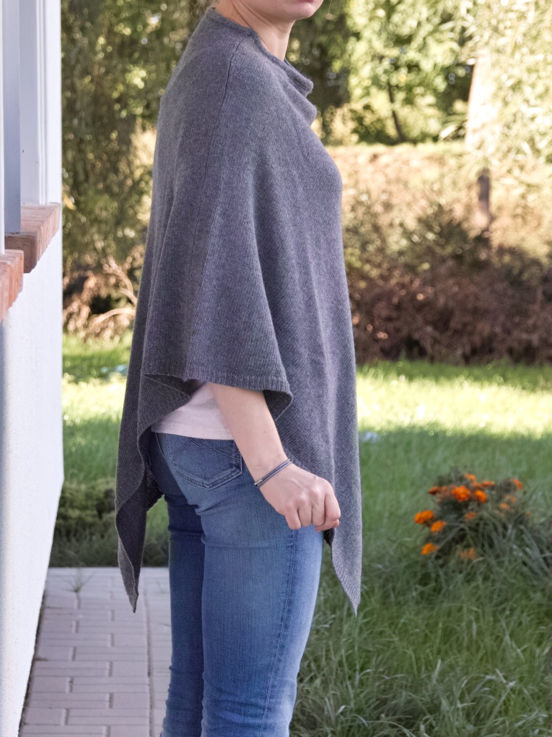 It has asymetrical shape, round neckline. Poncho is great for layering.
