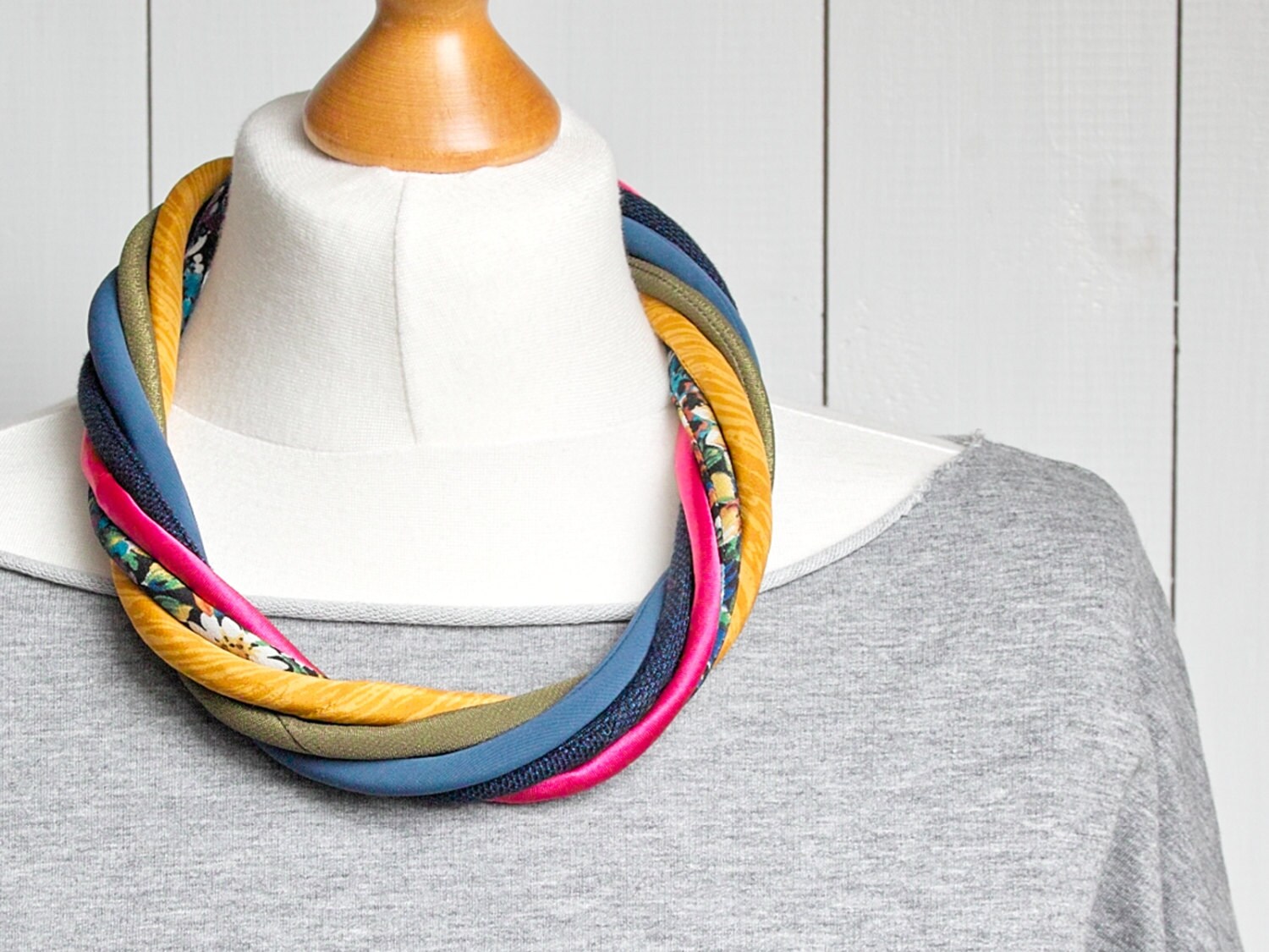 This textile necklace will make a great gift. This necklace is made of fabric thin stripes in matching shades of blue, yellow, pink, green, navy blue. All stripes have been made of upcycled fabrics. Necklace is very light and soft, it's so comfy to wear it.