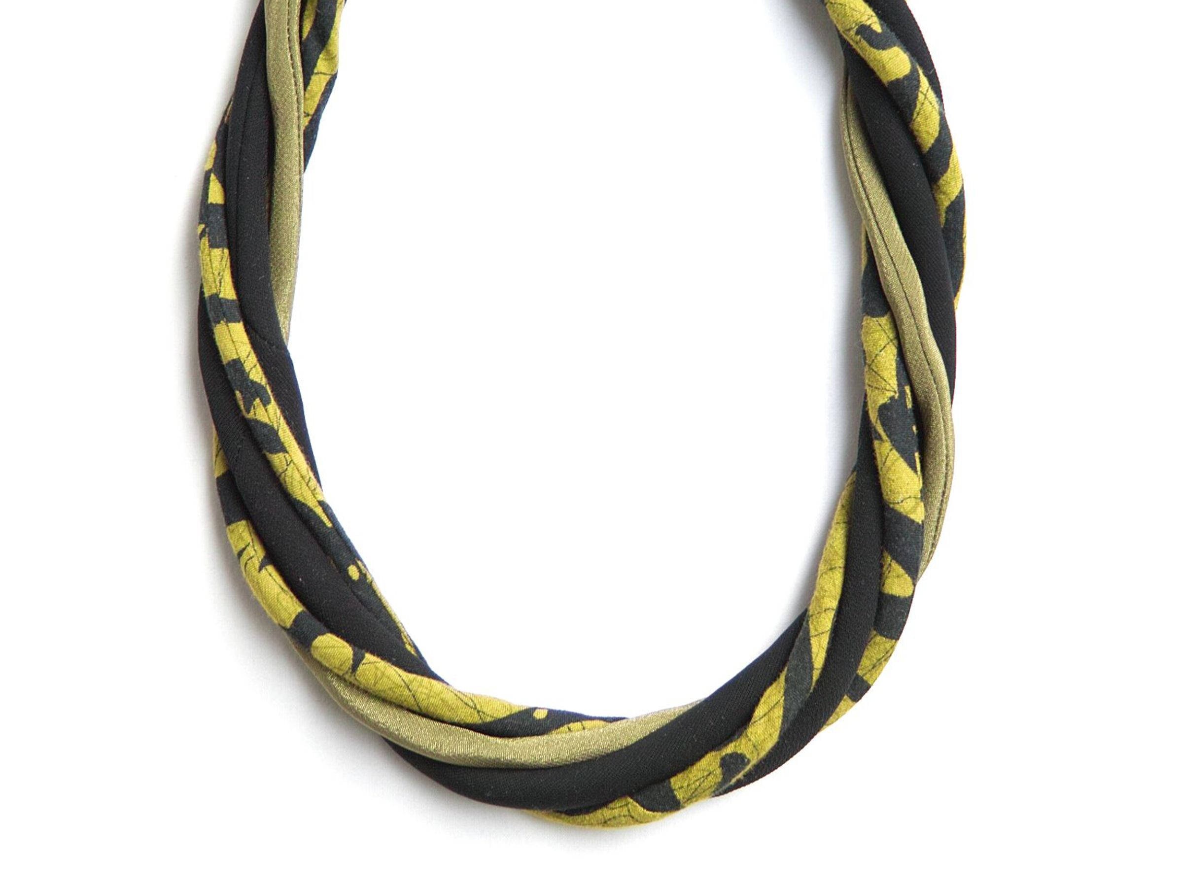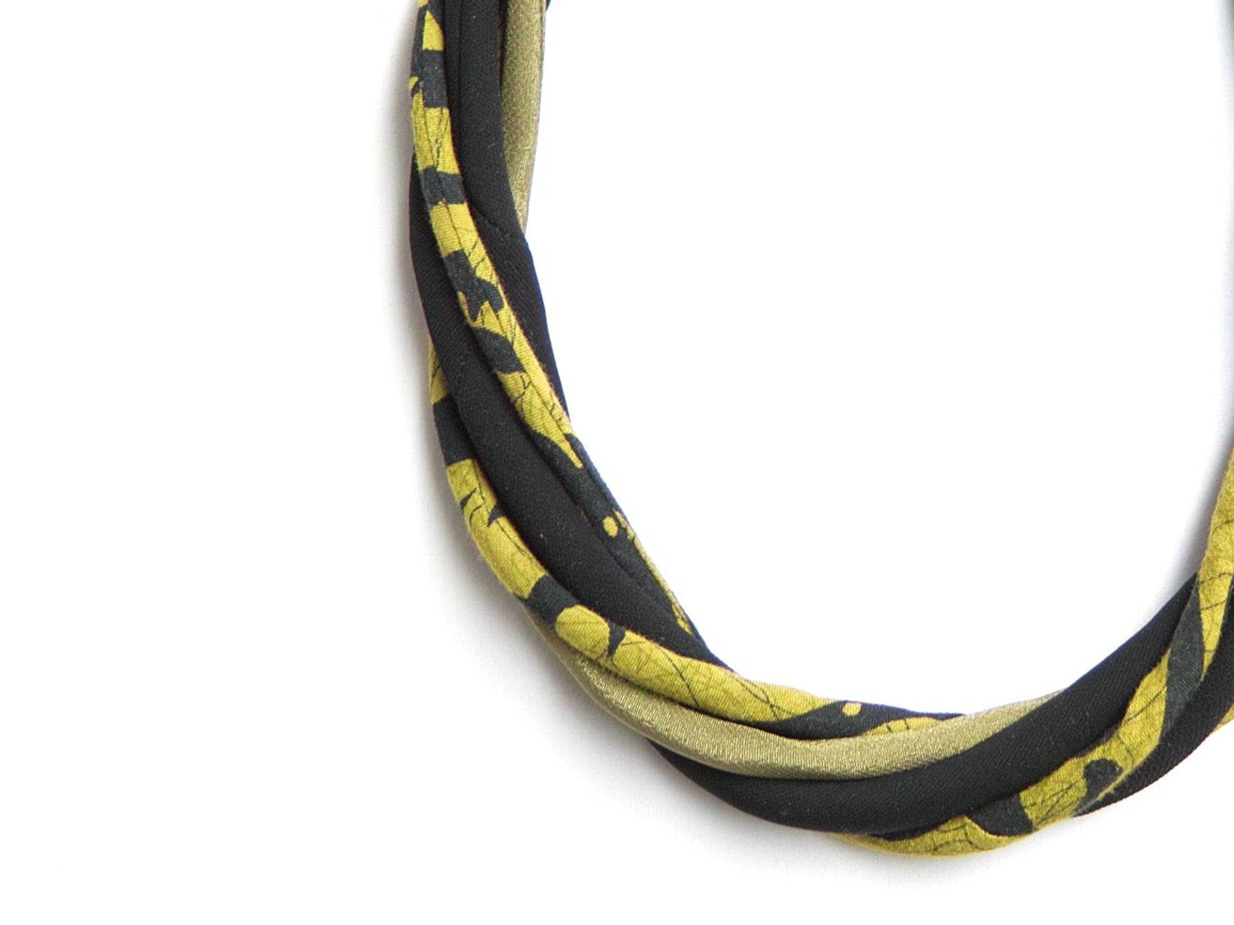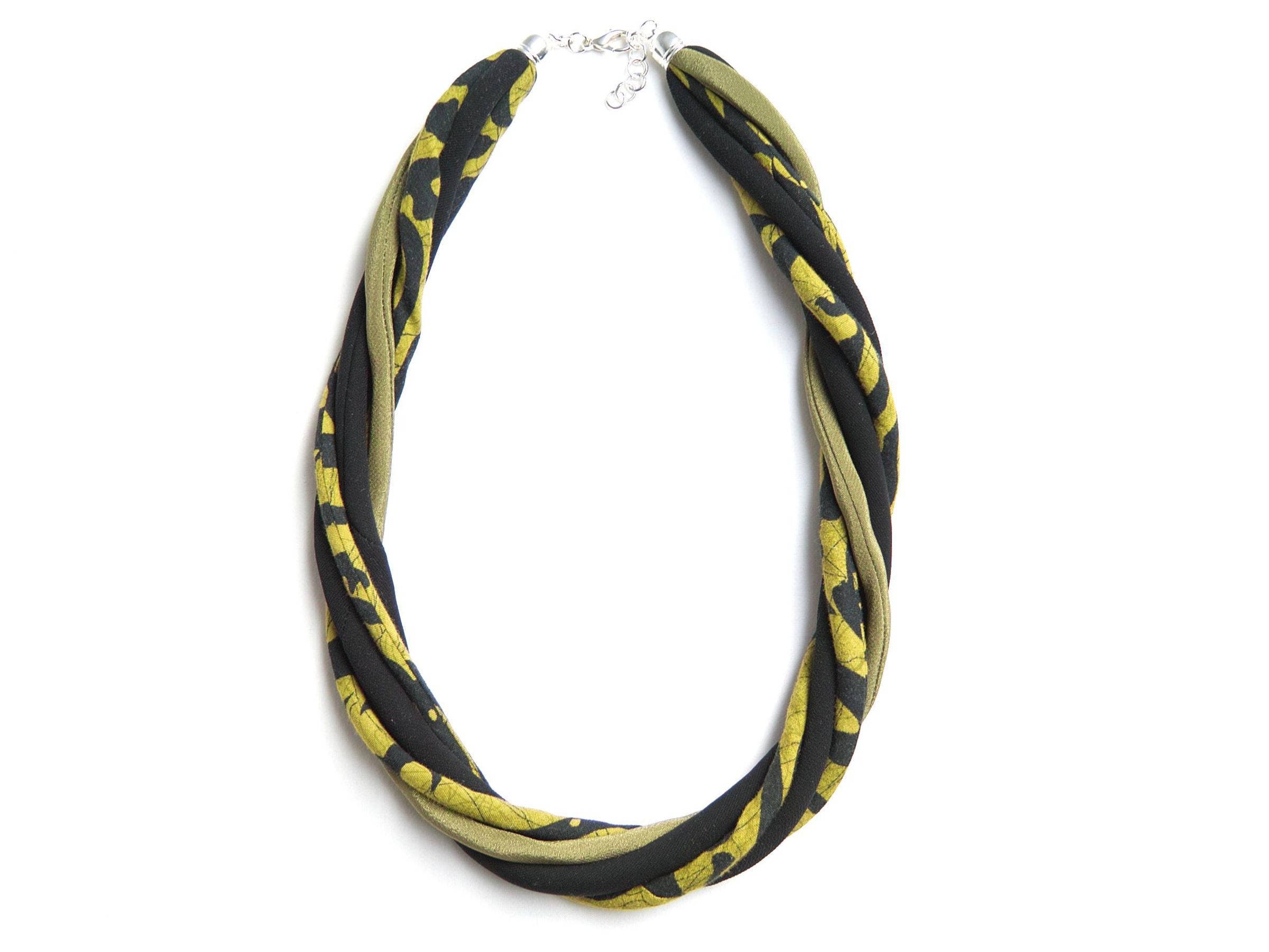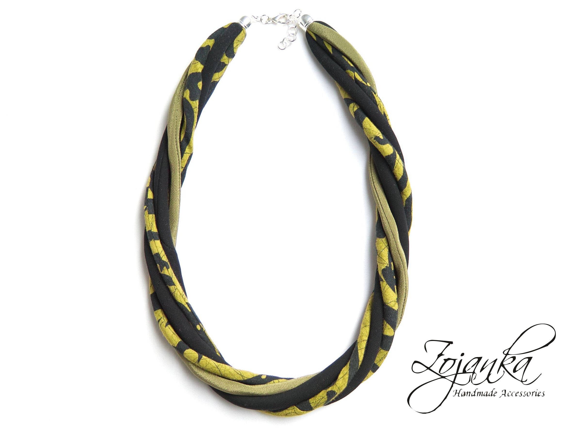 This textile necklace will make a great gift. Necklace is made of sewn fabric thin stripes in matching shades of green, black. All stripes have been made of upcycled fabrics. Necklace is very light and soft, it's so comfy to wear it. Necklace will make a great statement jewelry.