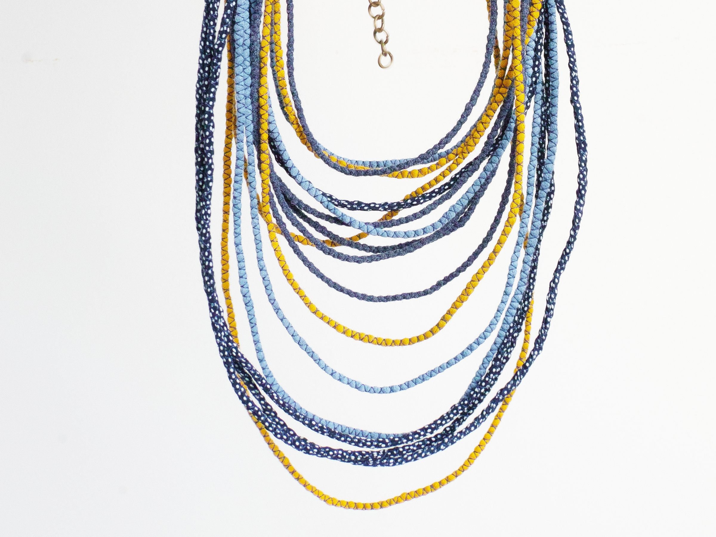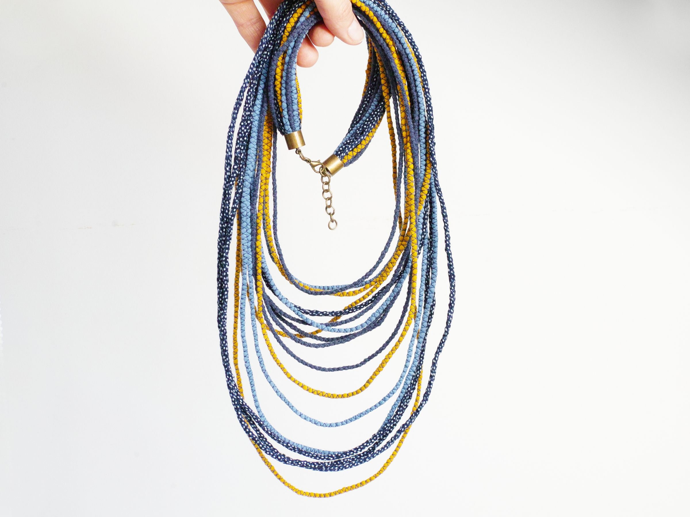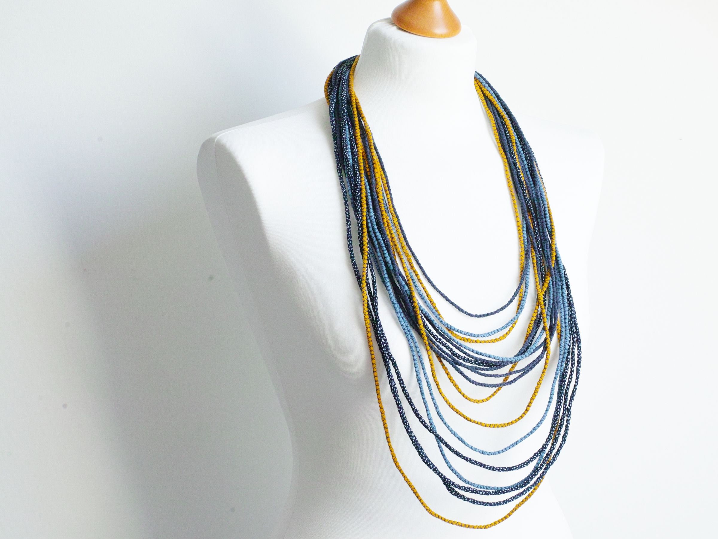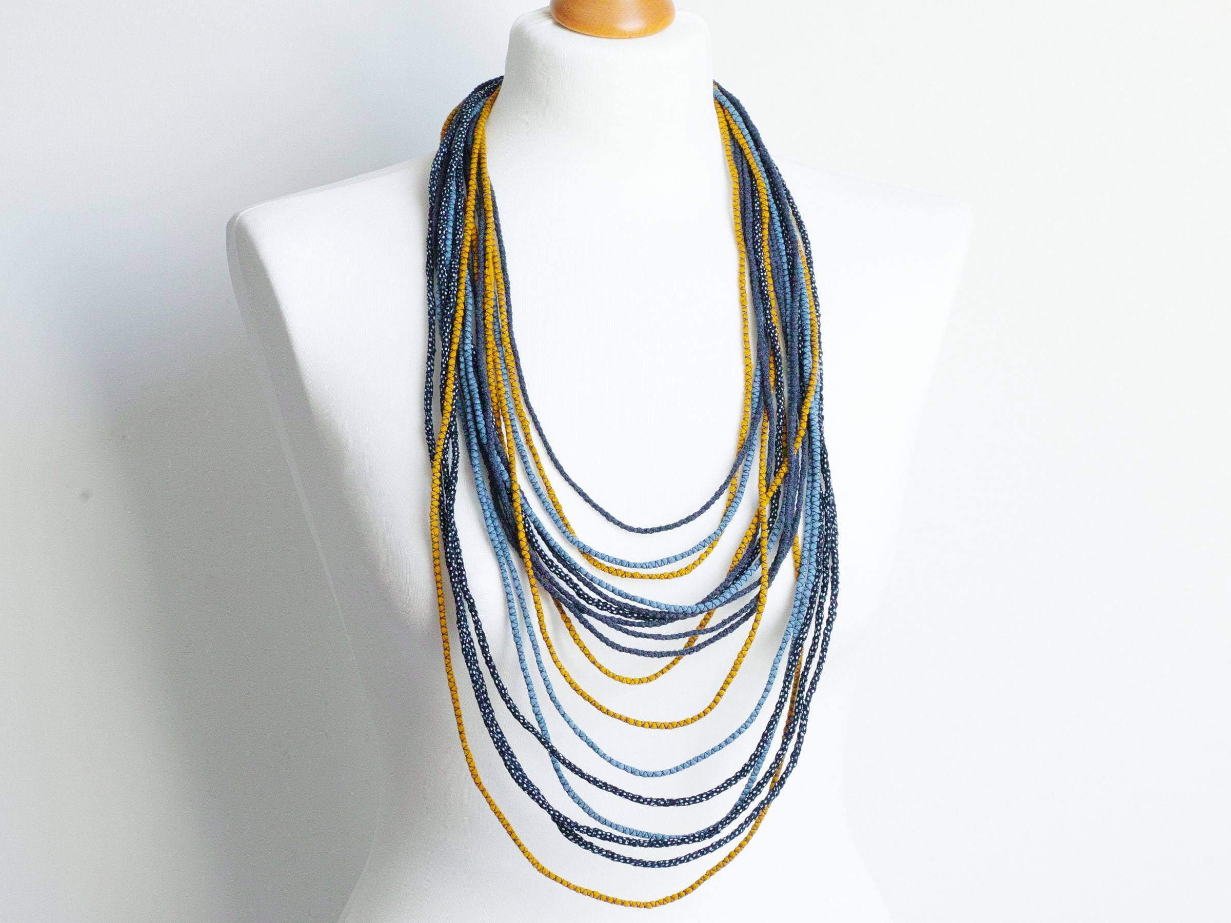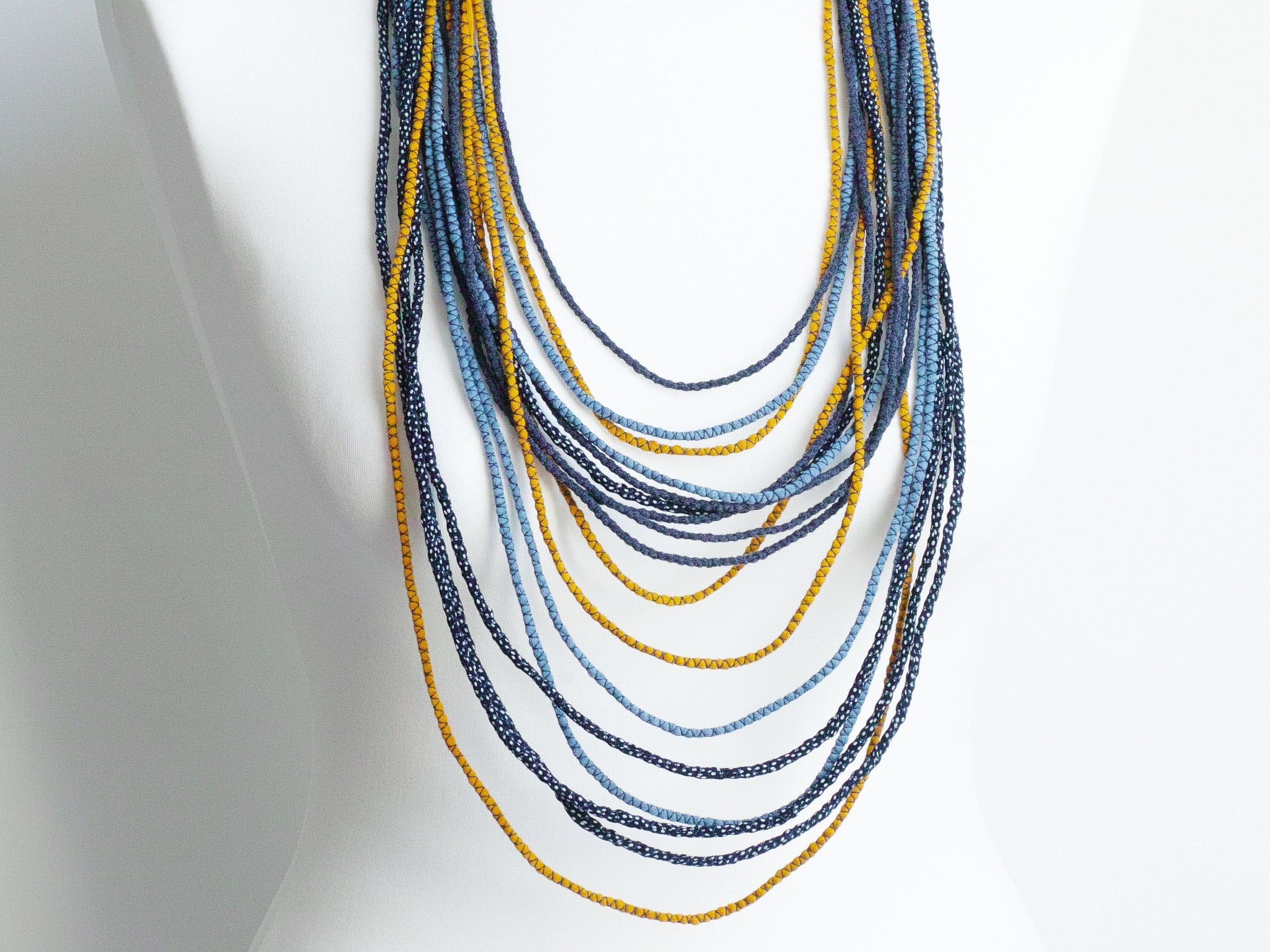 Long textile necklace for women. This layered multi strand necklace is made of sewn thin fabric stripes in shades of navy blue and honey yellow color. All stripes are made of upcycled fabrics that come from my mainstream production. Necklace is very light and comfy to wear. This necklace will match many outfits, casual ones and boho styled.